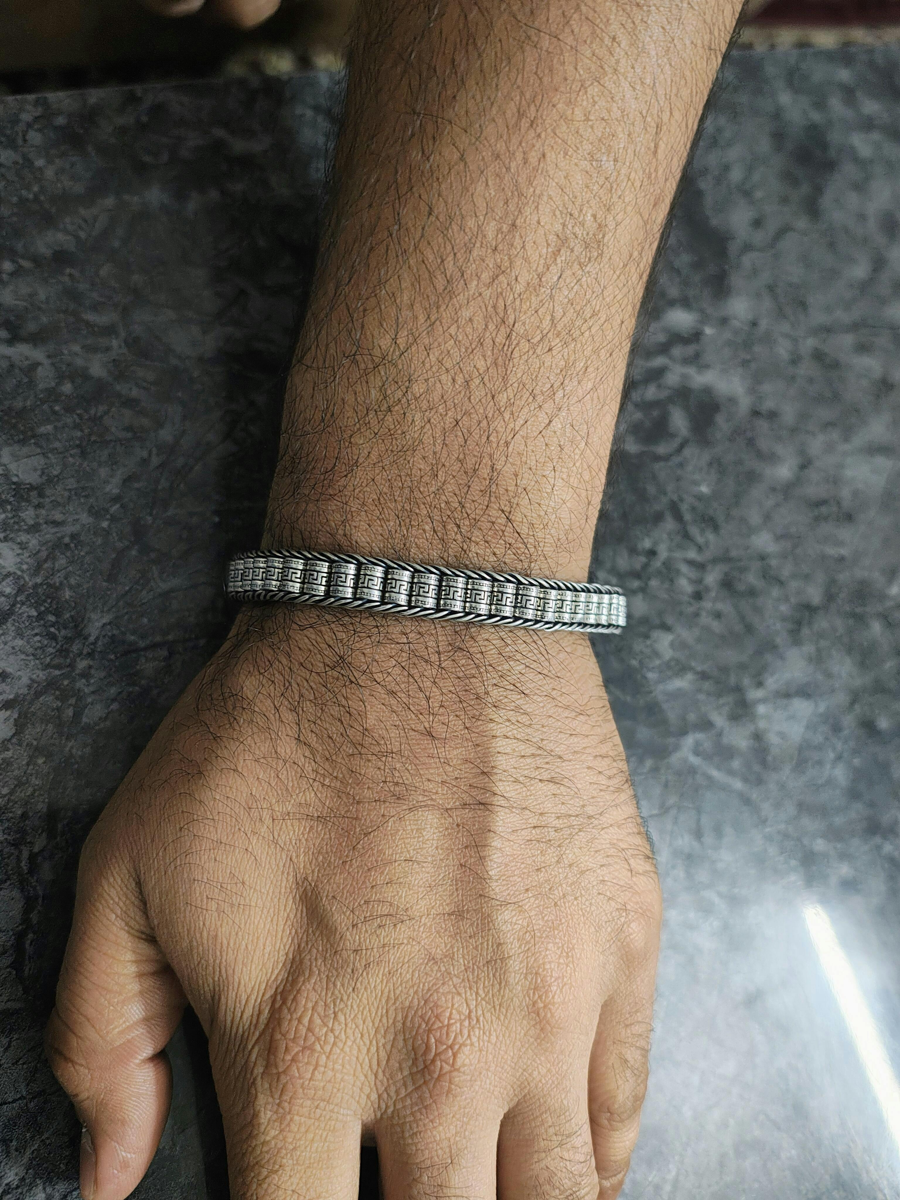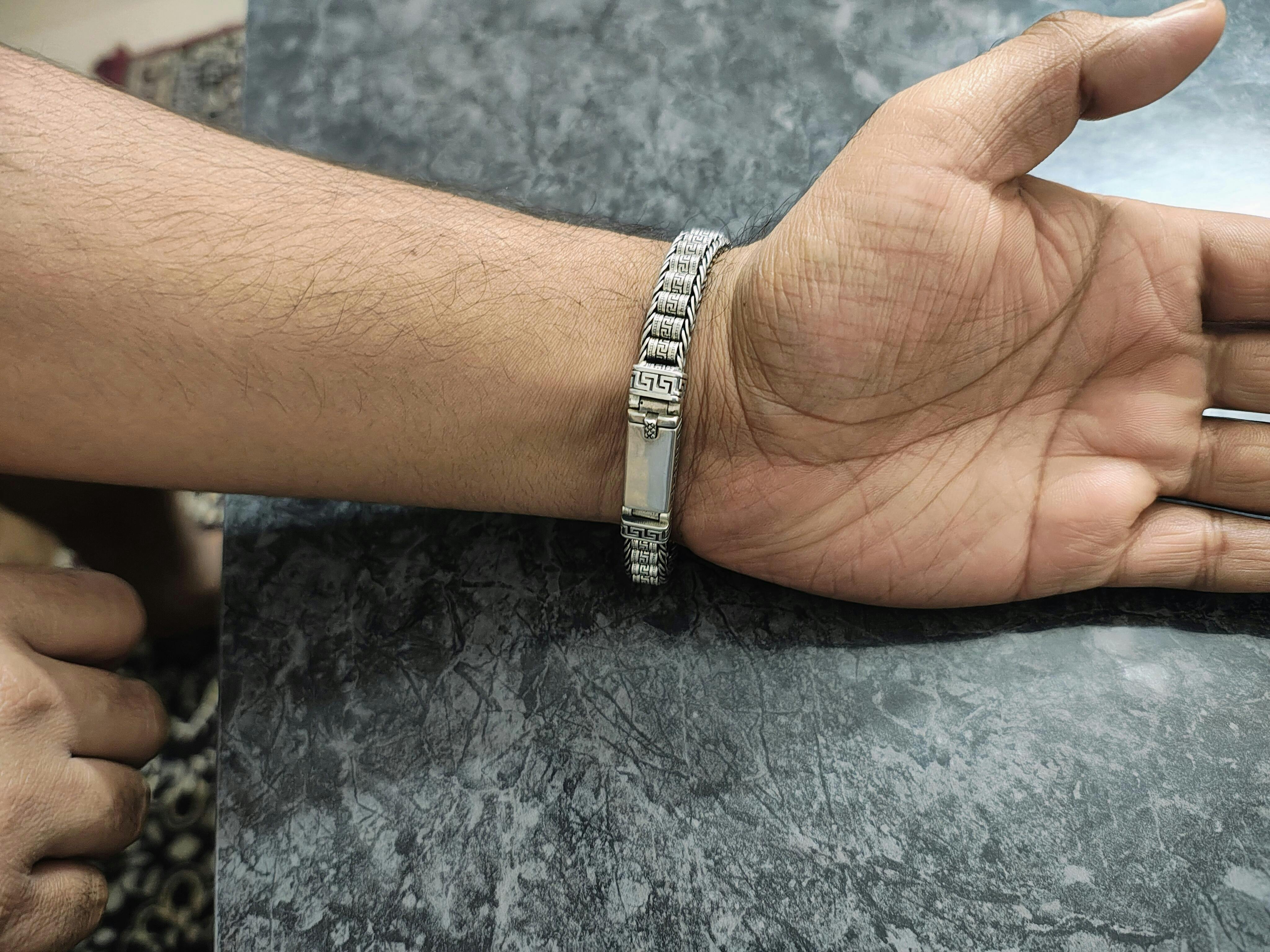 Step into a realm where tradition dances with contemporary flair. This bracelet seamlessly blends ancient symbolism with modern style, offering a bold statement that resonates with the discerning gentleman. As the Greek key pattern weaves its way around your wrist, feel the ancient power that symbolises unity, eternal flow, and boundless opportunities flow within you. Prepare to be mesmerised as the drum-shaped metal beads, meticulously crafted in oxidised silver, revolve on their own, adding an intriguing touch of movement and character to the bracelet. The sturdy build with woven chains securely holding the revolving drums ensures durability for everyday wear without compromising on style. The rectangular snap clasp effortlessly blends with the bracelet's design, guaranteeing a secure and hassle-free fit.