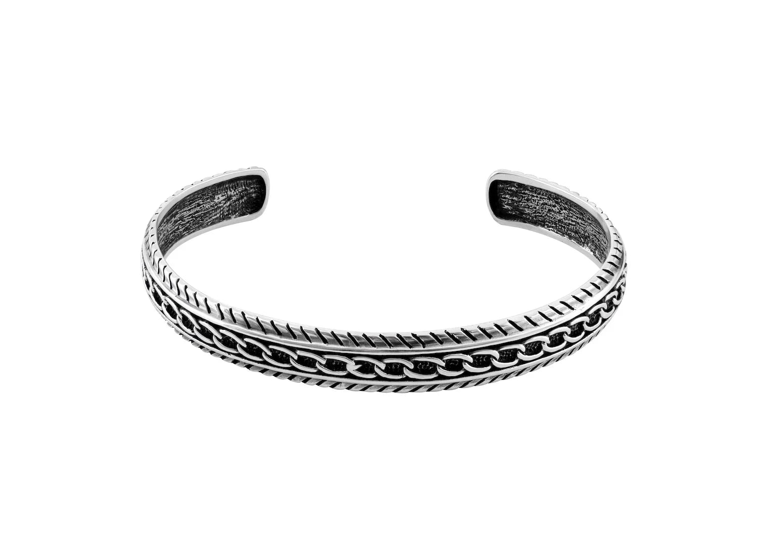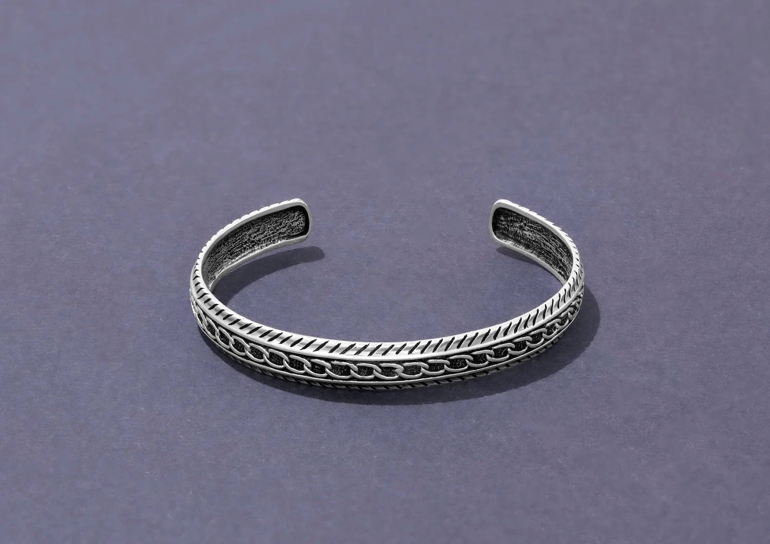 Defined by detail and driven by craftsmanship, the Chain Line Cuff Kada is a bold reinterpretation of a classic design. Handcrafted from solid 925 sterling silver, this men’s kada showcases an intricately carved chain motif running through its center — a symbol of connection, strength, and unbreakable will. The subtle oxidised finish enhances every groove and edge, giving it a rugged yet refined appeal.