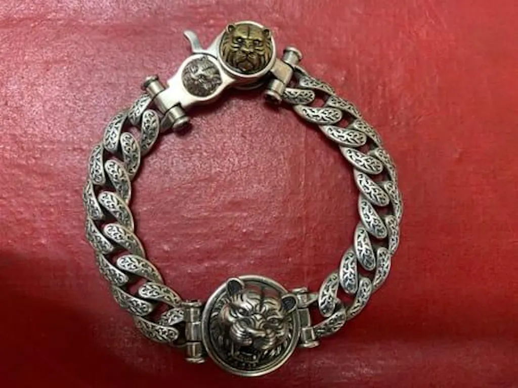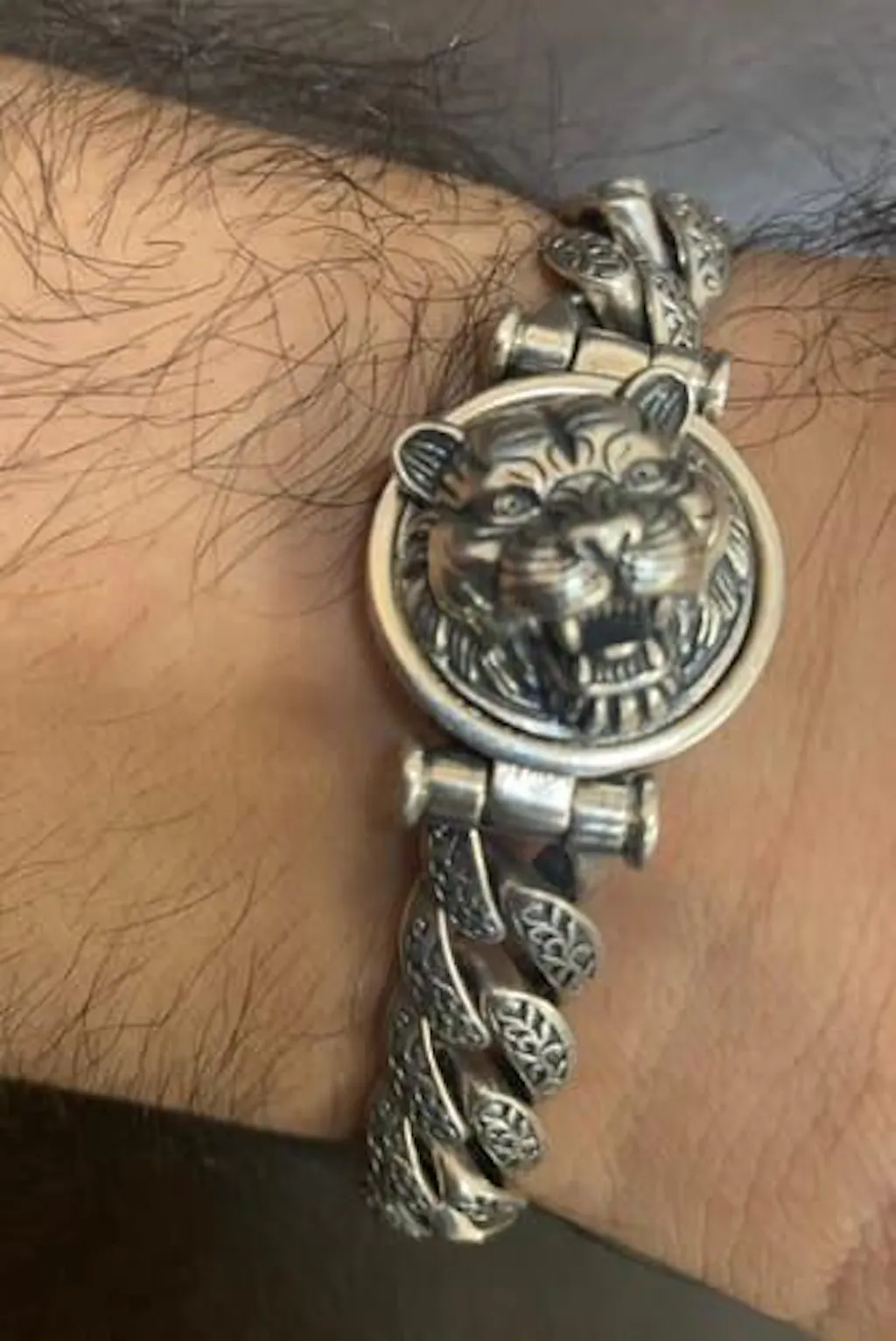 If you're looking to make a statement that's as bold as it is fierce, this Fearless Tiger Rotating Bracelet is your go-to wrist-wear. This oxidised silver masterpiece doesn't just follow the trend; it sets a new one. The link chain body mimics the tiger stripes with some captivating texturing. And then, the stars of the show – the tiger heads. Both the central and the golden head at the clasp are in on the action, effortlessly spinning with a flick of your finger. If you're a fidgeter or looking to soothe anxiety, this motion can be remarkably soothing. This bracelet isn't about what's in your wardrobe; it's about what's in you. Every ensemble, no matter the style, benefits from this bracelet. So whether you're rocking that casual look, slaying in formal, or riding the stylish waves in between, this bracelet is your ultimate secret weapon to ignite your style game.