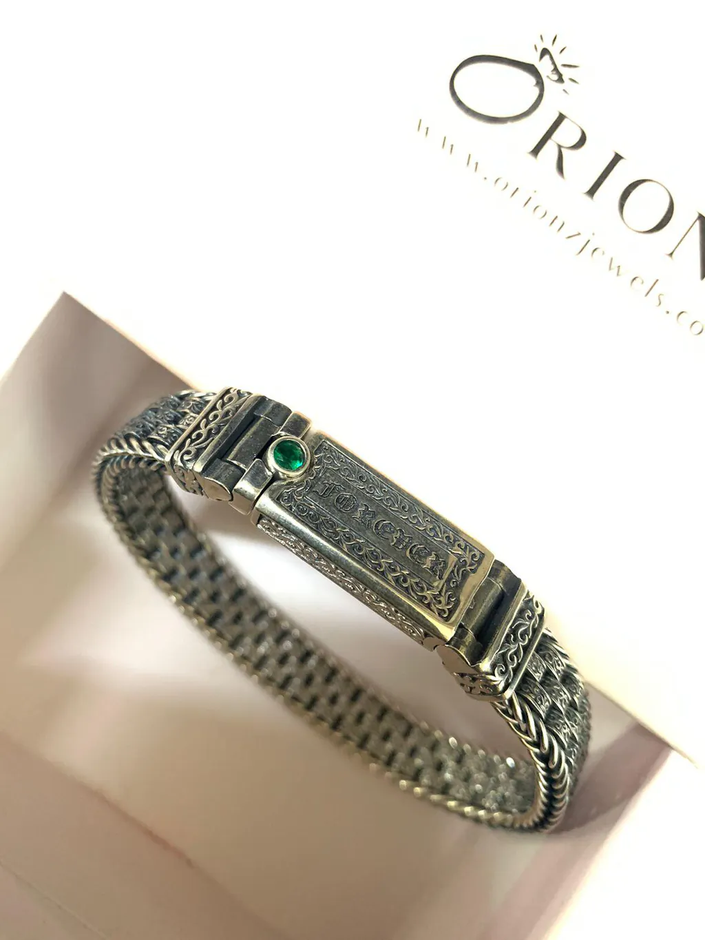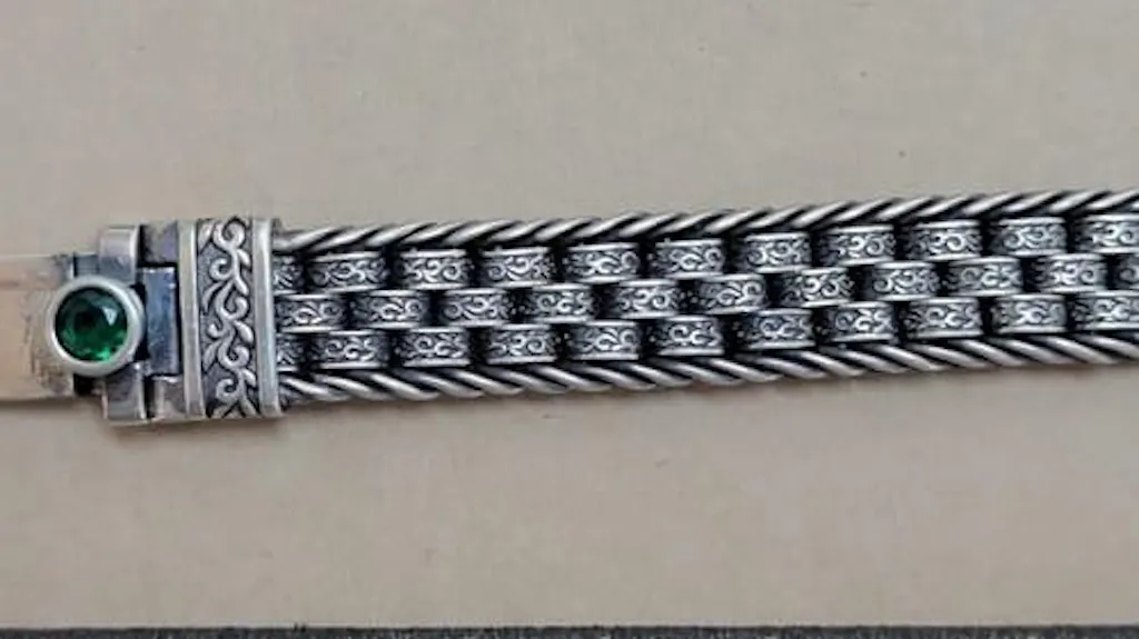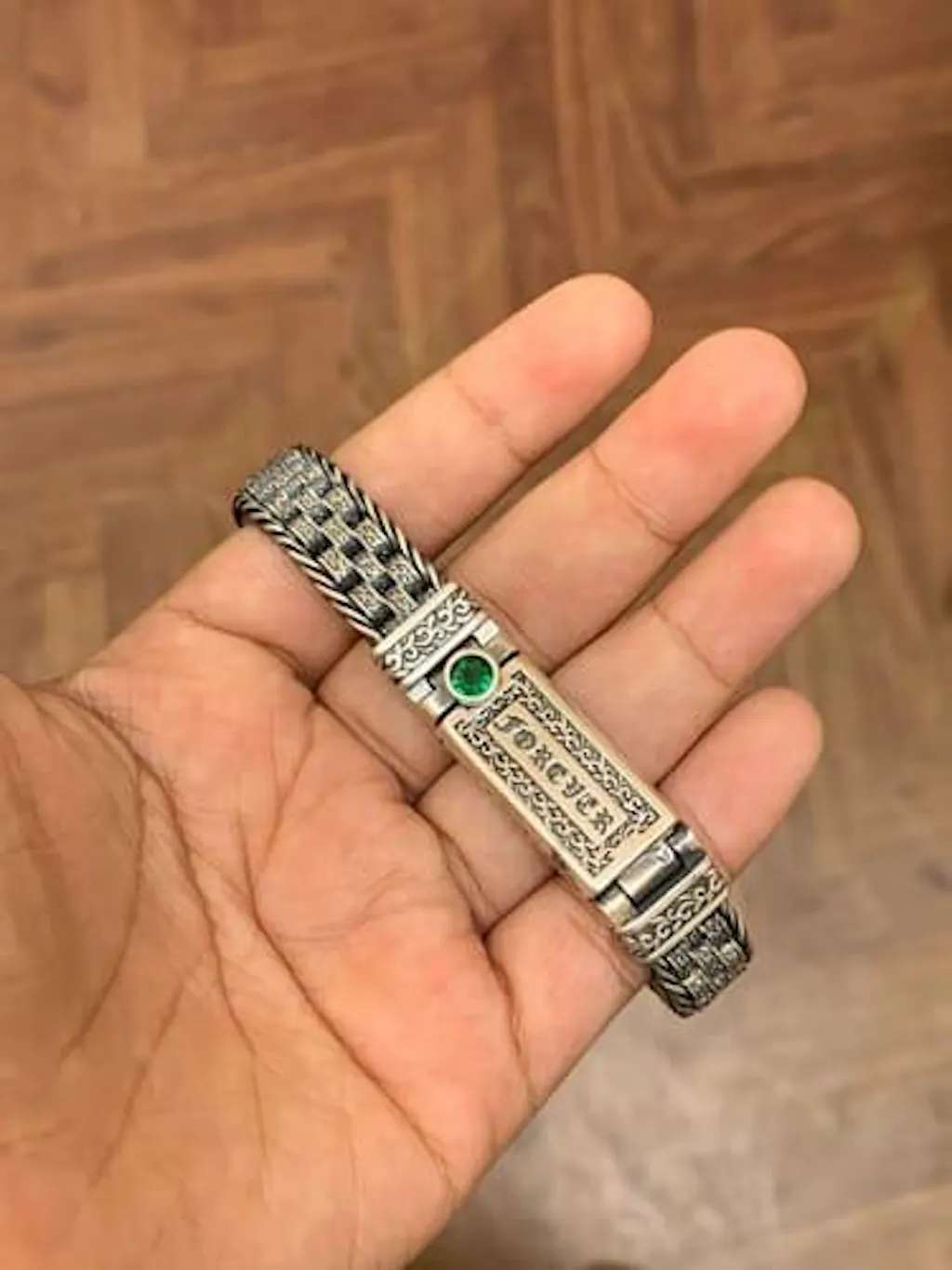 Swap norms for empowerment as you slap on this Forever Yours Oxidised Bracelet on your wrist. The bracelet's multi-level stacked, tiny oval segments are like individual works of art, each bearing intricate engravings. The design is all about audacity, far from delicate – it's here to make a bold statement. The box clasp spells 'forever,' etching your commitment right into the heart of this piece. An emerald-coloured stone adds an extra dollop of mystery. The top and bottom braided pattern holds together this piece, creating a look that's a clash of contrasts. Style-wise, this oxidised bracelet is incredibly versatile. It's the perfect accessory to elevate your ethnic look and make a statement at weddings, festivals, and special occasions. For a more contemporary twist, pair it with modern Indian fashion, like a kurta and jeans combination. For a western style wear it with co-ordinated pants and shirt.