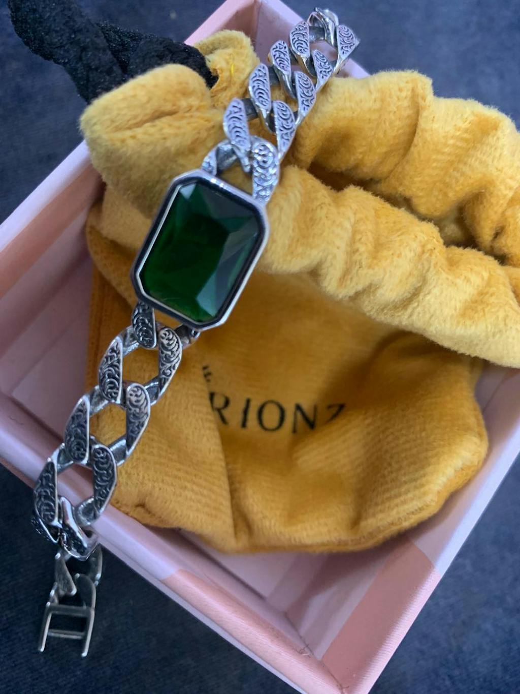 If you’re searching for your next statement bracelet, this Green Stone Cuban Bracelet is waiting to charm up your wrist. Showcasing a striking emerald-cut green stone, this piece delivers an elegant pop of colour to your ensemble. This bracelet features sleek, flattened Cuban links with a textured finish, adding substance to its style. The flat chain design is lighter and more streamlined compared to traditional rounded Cuban links, so you can wear this piece throughout the day without taxing your wrist. Merging classic charm with a trendy edge, this bracelet brings a chic touch to any outfit and makes a striking statement. For a cool colour alternative, check out the Blue Stone Cuban Bracelet available on our website.
