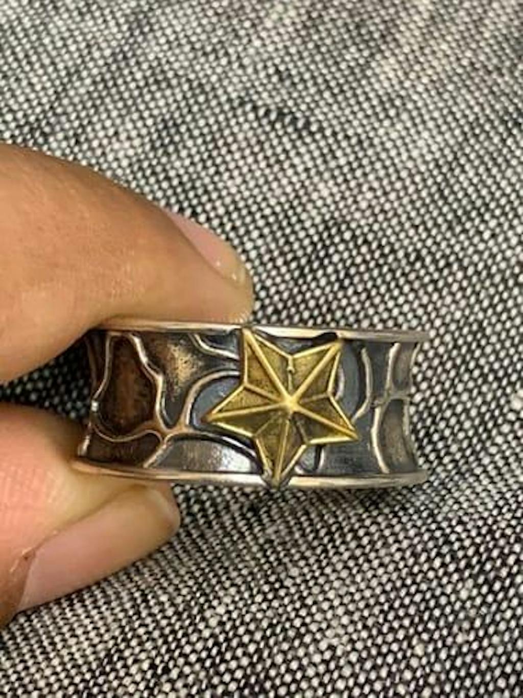 Shine like a star with our Lucky Star Ring! Crafted from oxidised silver, this ring features a captivating charcoal-coloured gradient body with scale-like, twirly lines that add a unique twist to your style. The star centrepiece is adorned with a contrasting yellow-gold finish, making it pop with glamour. The star on this ring symbolises life's journey, highlighting the multitude of paths we explore in our lifetime. When paired with Western attire, it adds a touch of celestial charm to your look. Try it with a classic white shirt and jeans for a chic style. It's also a great complement to Indian attire. Wear it with your favourite kurta to effortlessly blend traditional and modern aesthetics. Designed for everyday wear, whether you're headed to work, a casual outing, or a special event, it's a statement piece that's sure to garner compliments.