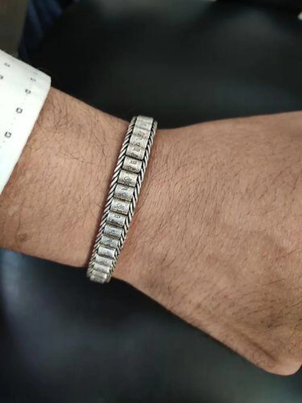 Introducing the Revolving Om Barrel Bracelet - a beautiful accessory that takes you back to your mountain and monastery adventures. Crafted with exquisite silver prayer wheels, this bracelet is an absolute stunner. The chant written on it in the Tibetan language is - 'Om Mani Padme Hum'.