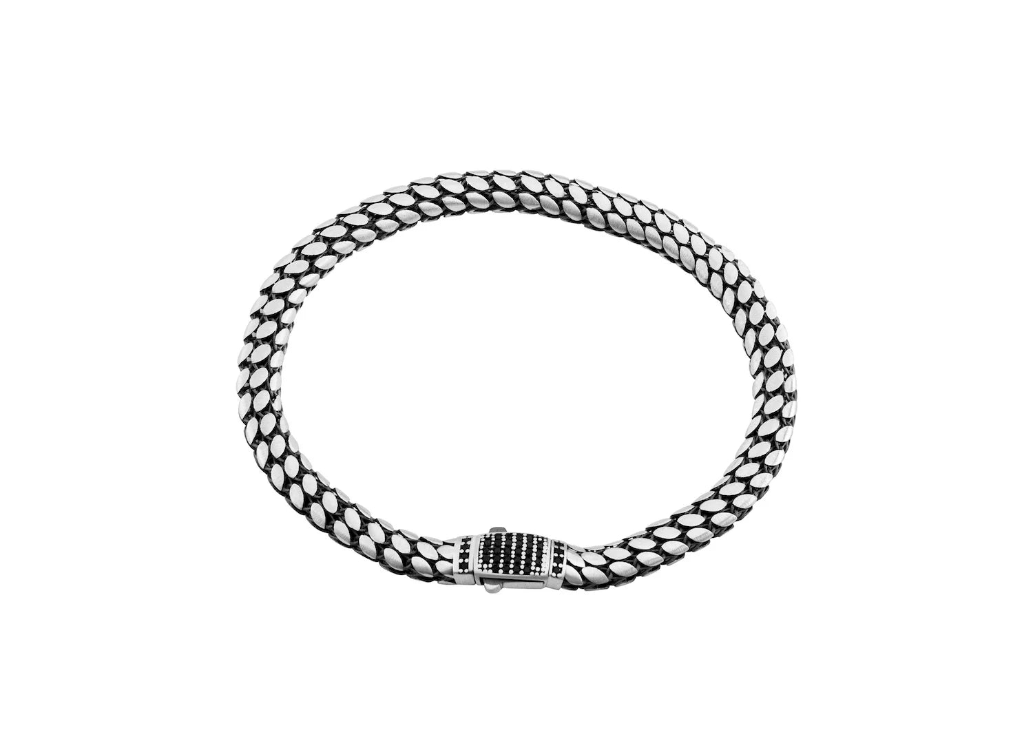 Its oxidised finish brings out deep contrasts that enhance every curve and contour, while the black stone-studded clasp adds a touch of modern sophistication. Designed for the man who values power in subtlety, this silver bracelet transitions effortlessly from boardroom to nightlife.