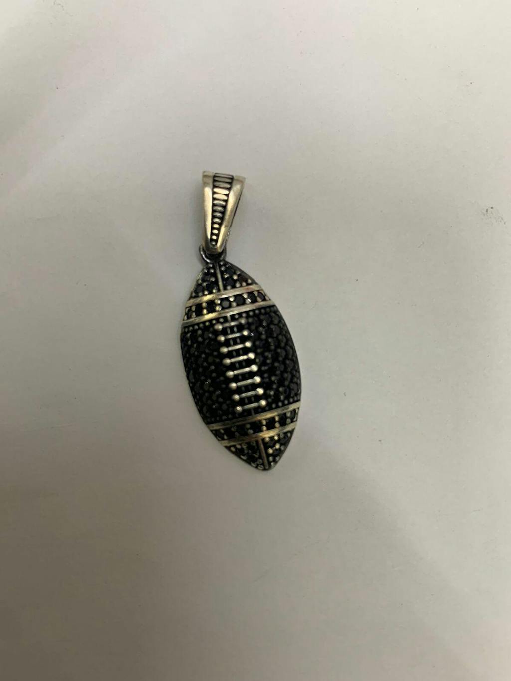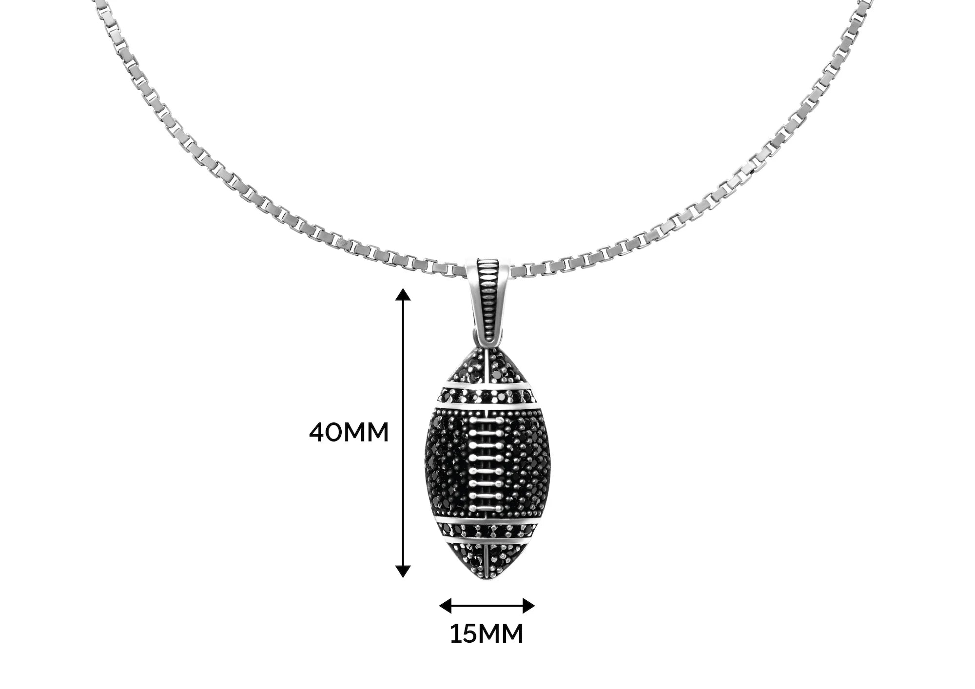 Score big with style! This striking pendant is designed to resemble an iconic rugby ball, featuring a sleek oval shape that tapers at both ends. The body is crafted from shimmering black semi-precious stones, adding depth and intrigue, while intricate details in contrasting silver elevate its sporty elegance. Mimicking the classic stitching and seams of a rugby ball, this piece captures the spirit of the game and celebrates the passion of players and fans alike. Whether you’re a rugby lover or simply appreciate the artistry, this Touchdown Pendant is your winning accessory—perfect for making a bold statement on and off the field!