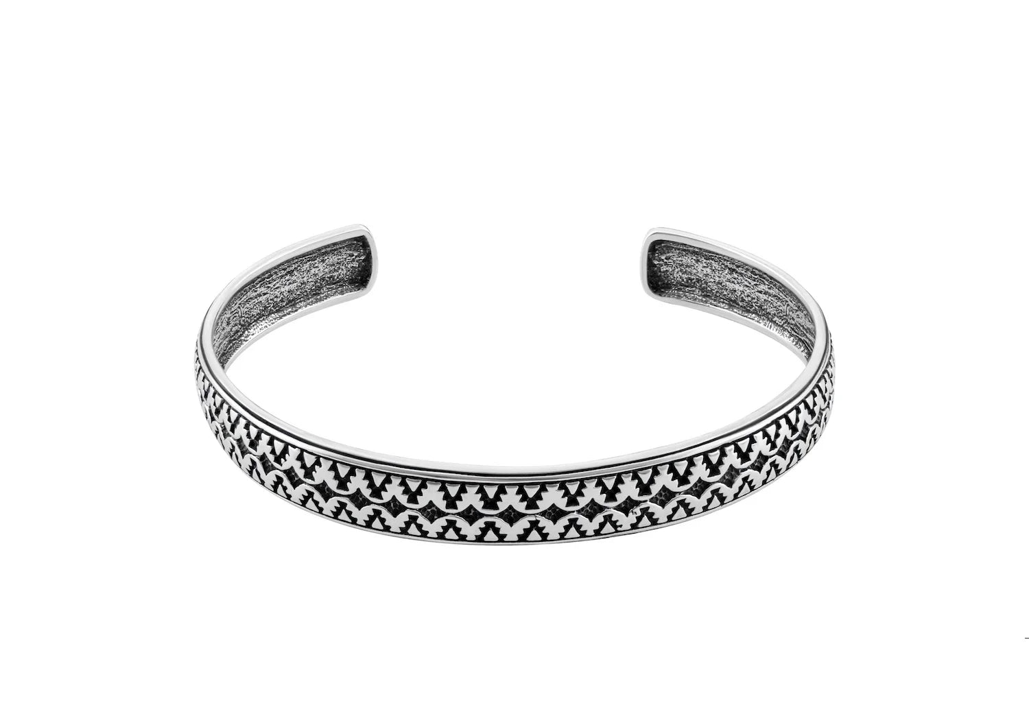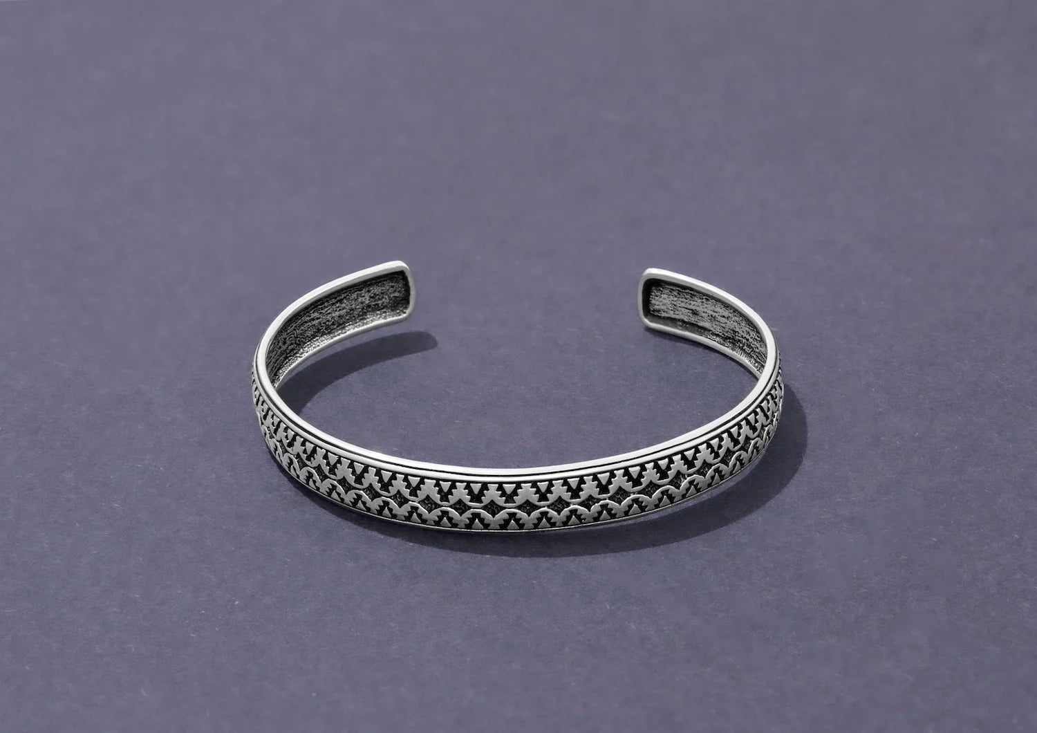 Bold lines, sharp symmetry, and timeless design — the Trident Edge Cuff Bracelet embodies strength refined through craftsmanship. Handcrafted from 925 sterling silver, this men’s cuff bracelet showcases a striking pattern inspired by ancient armour motifs, highlighted through a dark oxidised finish that adds depth and dimension to every detail.